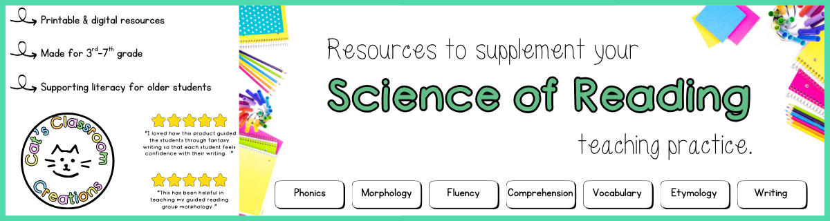 Welcome to Cat’s Classroom! Here you will find a range of literacy teaching ideas and resources for students in grades 3-7. My reading and writing activities are aligned with the most current Science of Reading research.