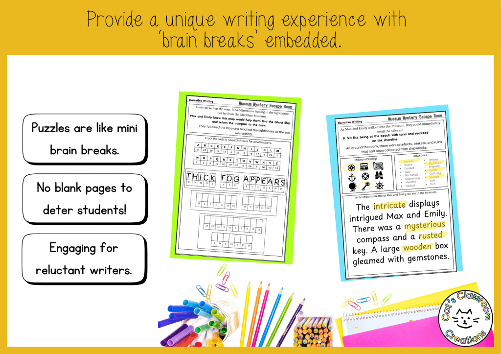 Traditional writing prompts often leave students feeling stuck or unmotivated. By incorporating escape room puzzles throughout, this resource turns writing into an adventure. As students solve each puzzle, they unlock new plot developments and directions for their story, which: